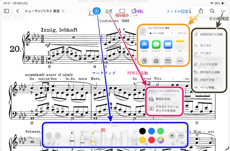 このメニューには、閲覧、共有、注釈、署名、画像編集、スキャンなど、日常的によく使われる操作が一通り揃っています。上の表のとおりです。