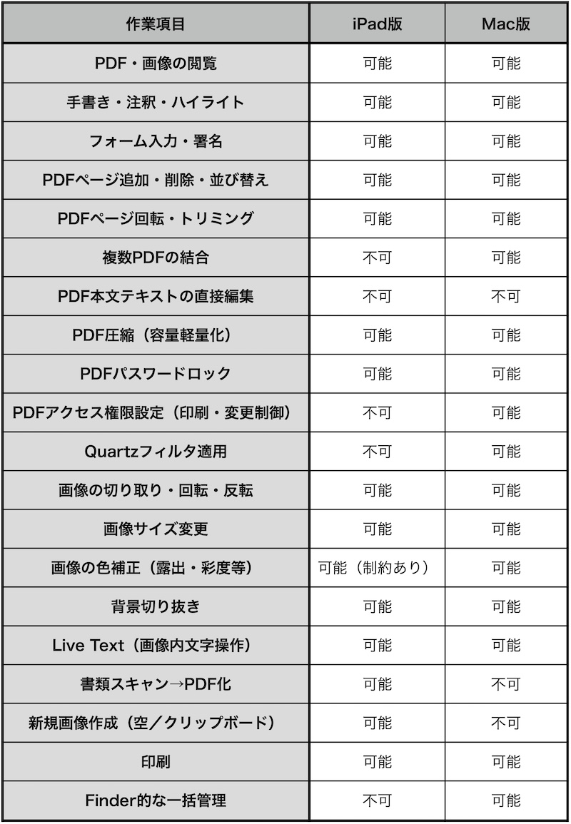この章では、iPad版プレビューとMac版プレビューで、出来ること・出来ないことにどのような違いがあるのかを一覧表で整理しましたのでご覧ください。