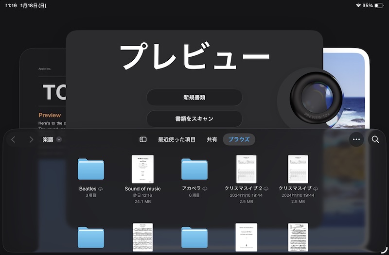 先に説明した「ファイルアプリから経由」ではなく、プレビューアプリ単体からPDFや画像を探して開ける点が、従来のiPadOSにおける操作導線との大きな違いです。