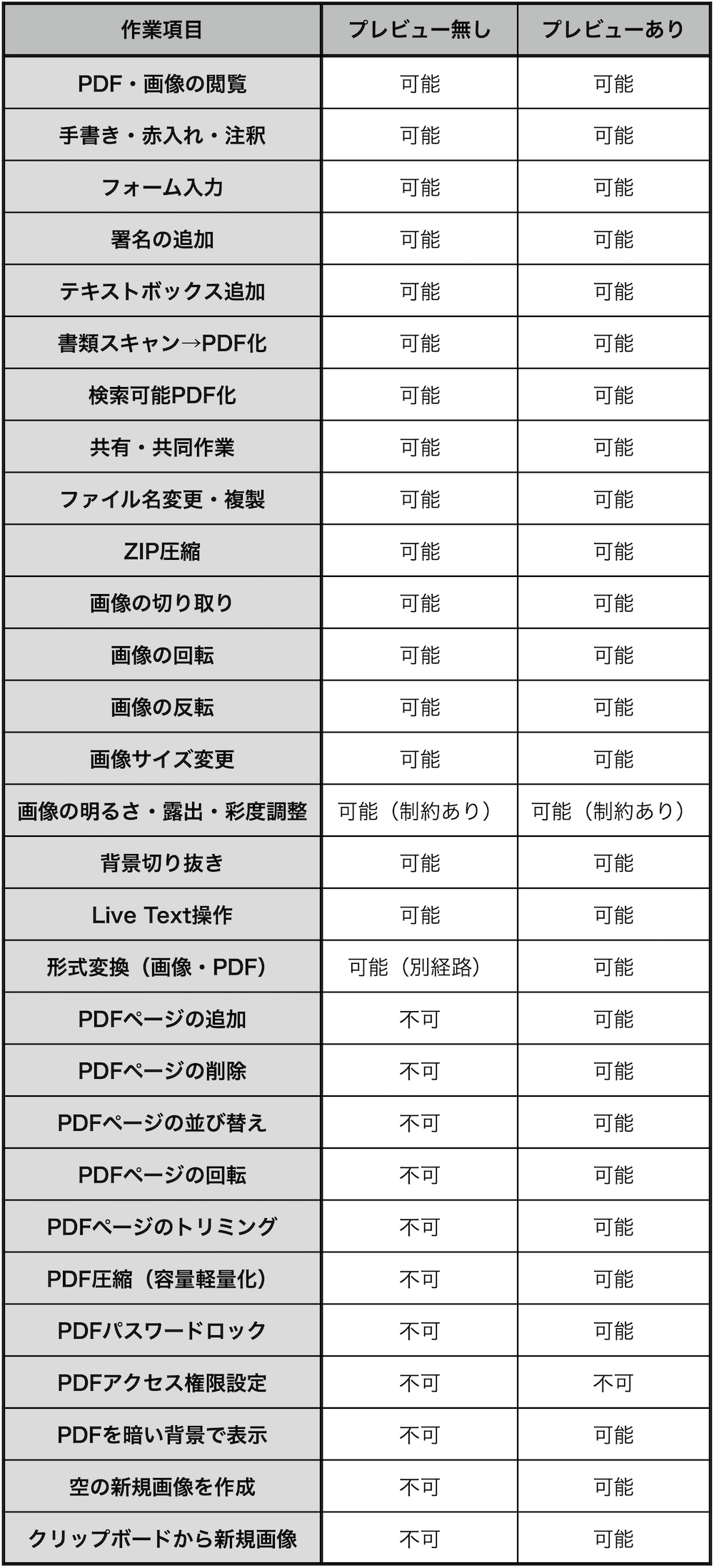 この表から分かるのは、iPadにプレビューが追加されたことで、新たに可能になった作業と、従来から可能だった作業が明確に分かれたという点です。