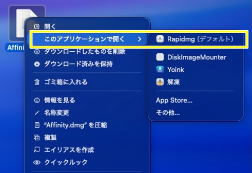 - 再度Rapidmg.dmgを右クリックして「このアプリケーションで開く」にカーソルを持ってくると、選択肢の一番上にRapidmg(デフォルト)と表示されるのでクリックする。