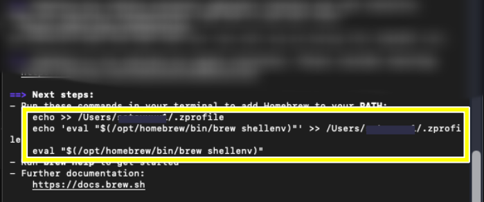 - echo ‘eval “$(/opt/homebrew/bin/brew shellenv)”‘ >> /Users/あなたのユーザー名/.zprofile
