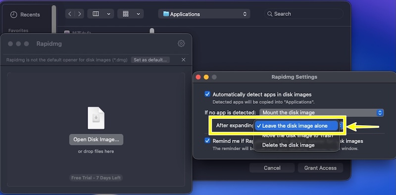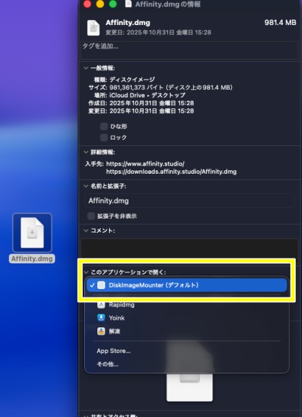 多くのアプリと根本的に違うのは、Rapidmg自体を起動して操作するタイプではなく、事前設定によりDMGファイルを処理するための補助ツールである点です。