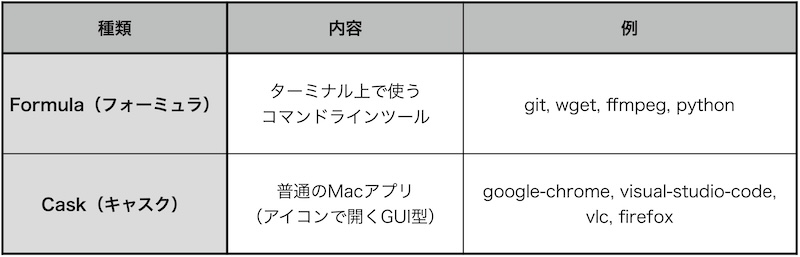 Homebrewで扱えるアプリに関する説明をします。以下の表のように2種類あります。