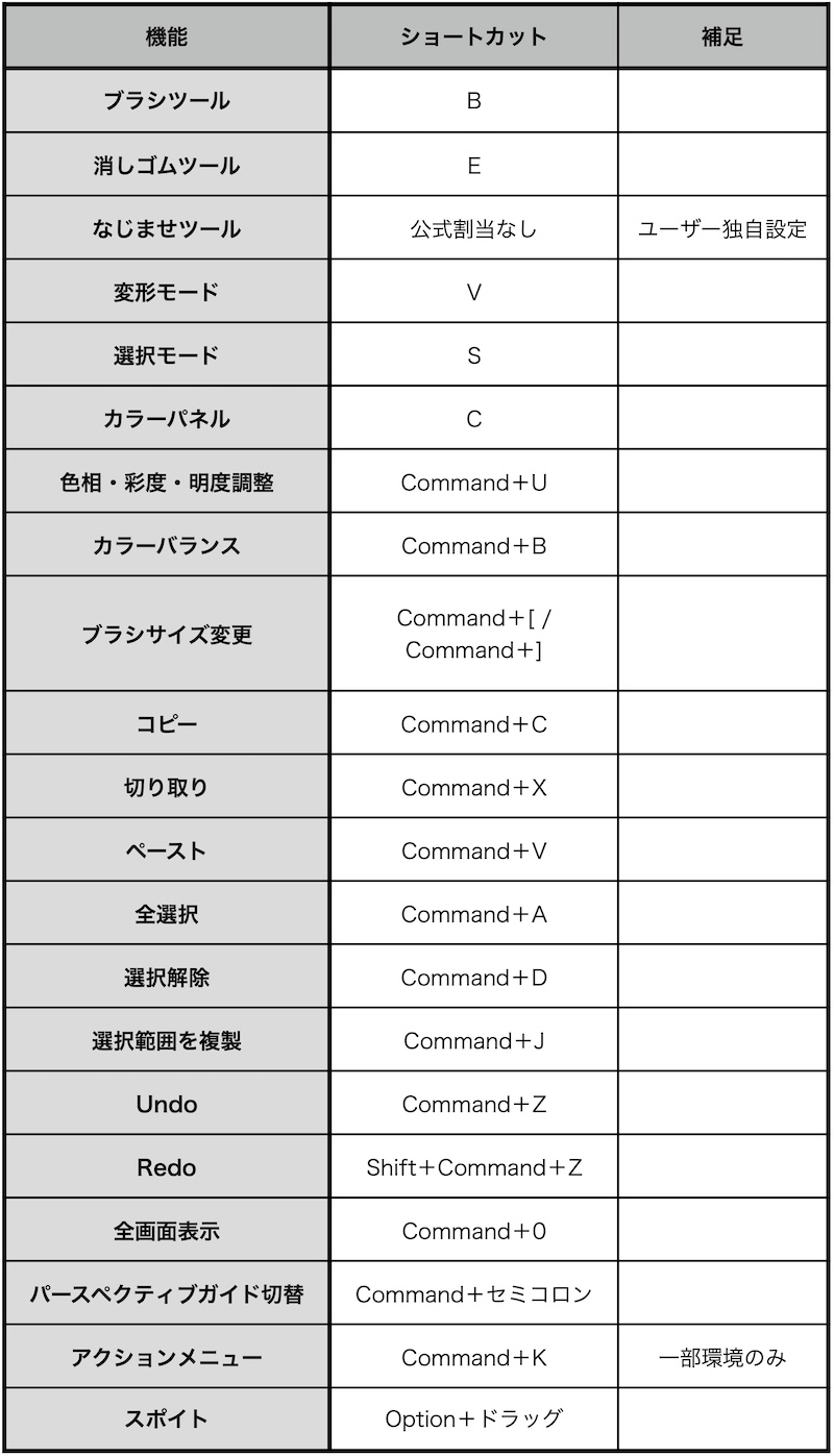 現時点でProcreate公式ショートカット一覧に割り当ては存在しない。ただし、外部フォーラムでは「ショートカット設定アプリや左手デバイス側で割り当てて使用している」という報告がある。今後のアップデートで公式対応する可能性はある。